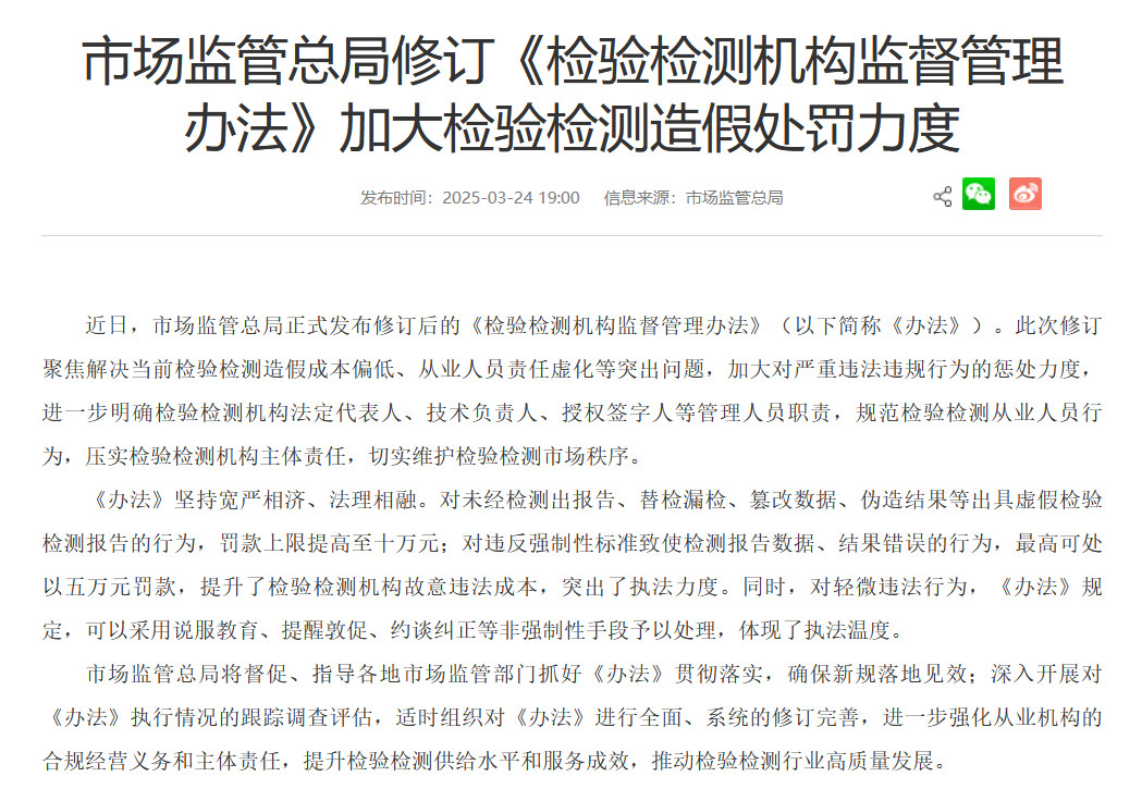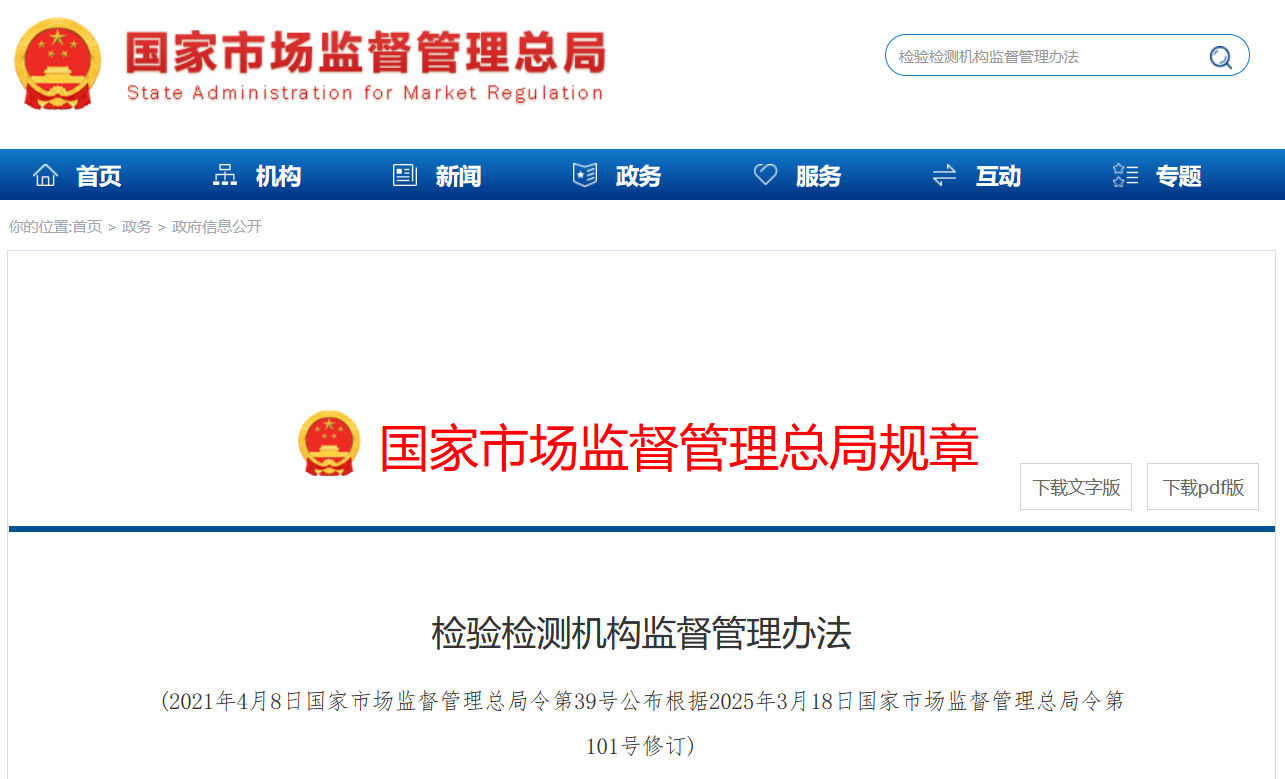 市場監(jiān)管總局正式發(fā)布修訂后的《檢驗檢測機構(gòu)監(jiān)督管理辦法》第一條 為了加強檢驗檢測機構(gòu)監(jiān)督管理工作,規(guī)范檢驗檢測機構(gòu)從業(yè)行為,營造公平有序的檢驗檢測市場環(huán)境,依照《中華人民共和國計量法》及其實施細則、《中華人民共和國認證認可條例》等法律、行政法規(guī),制定本辦法。第二條 在中華人民共和國境內(nèi)檢驗檢測機構(gòu)從事向社會出具具有證明作用的檢驗檢測數(shù)據(jù)、結(jié)果、報告(以下統(tǒng)稱檢驗檢測報告)的活動及其監(jiān)督管理,適用本辦法。法律、行政法規(guī)對檢驗檢測機構(gòu)的監(jiān)督管理另有規(guī)定的,查看詳情>>