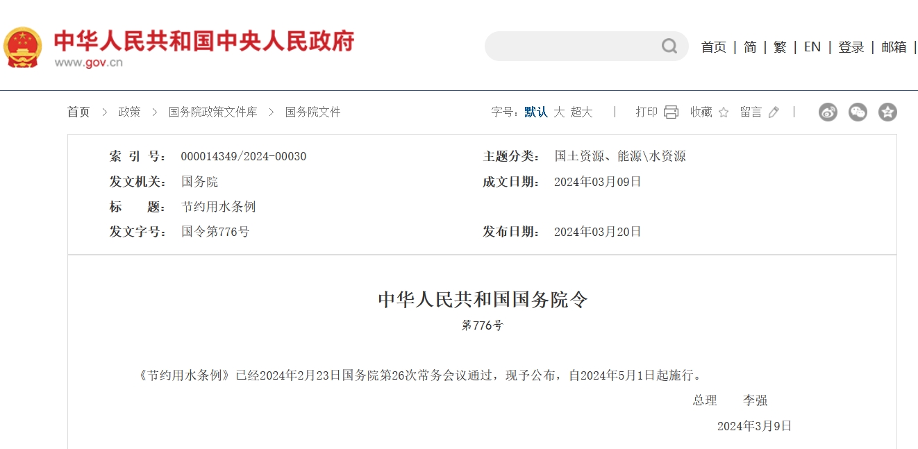 節(jié)約用水條例將于5月1日實施中華人民共和國國務(wù)院令第776號《節(jié)約用水條例》已經(jīng)2024年2月23日國務(wù)院第26次常務(wù)會議通過,現(xiàn)予公布,自2024年5月1日起施行??偫怼 ±顝姟 ?ensp; 2024年3月9日 節(jié) 約 用 水 條 例第一章 總 則第一條 為了促進全社會節(jié)約用水,保障國家水安全,推進生態(tài)文明建設(shè),推動高質(zhì)量發(fā)展,根據(jù)《中華人民共和國水法》等有關(guān)法律,制定本條例。第二條 本條例所稱節(jié)約用水(以下簡稱查看詳情>>