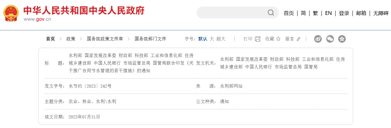 水利部 國(guó)家發(fā)展改革委 財(cái)政部等聯(lián)合印發(fā)《關(guān)于推廣合同節(jié)水管理的若干措施》水利部 國(guó)家發(fā)展改革委 財(cái)政部 科技部 工業(yè)和信息化部 住房城鄉(xiāng)建設(shè)部 中國(guó)人民銀行 市場(chǎng)監(jiān)管總局 國(guó)管局聯(lián)合印發(fā)《關(guān)于推廣合同節(jié)水管理的若干措施》的通知水節(jié)約〔2023〕242號(hào)各省、自治區(qū)、直轄市水利(水務(wù))廳(局)、發(fā)展改革委、財(cái)政廳(局)、科技廳(委、局)、工業(yè)和信息化主管部門、住房城鄉(xiāng)建設(shè)廳(委、管委、局)、人民銀行上海總部、各分行、營(yíng)業(yè)管理部、各省會(huì)(首府)城市中心支行、各副省級(jí)城市中查看詳情>>