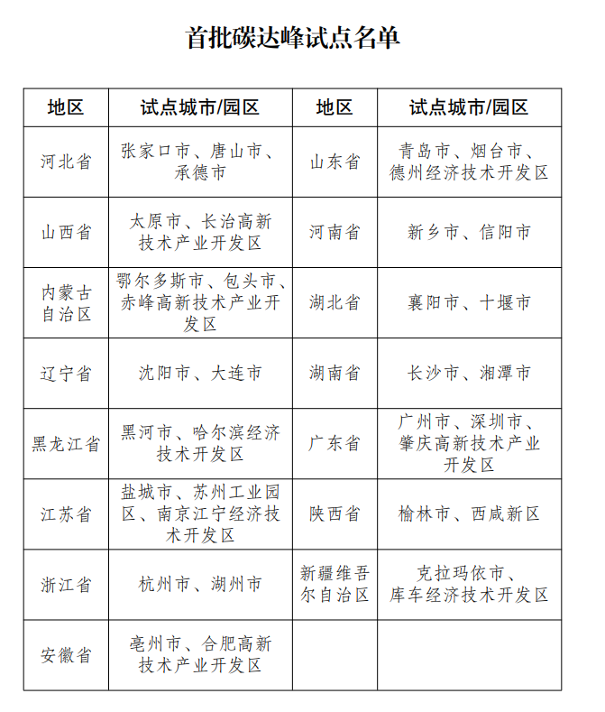 我國(guó)首批碳達(dá)峰試點(diǎn)名單公布國(guó)家發(fā)展改革委辦公廳關(guān)于印發(fā)首批碳達(dá)峰試點(diǎn)名單的通知發(fā)改辦環(huán)資〔2023〕942號(hào)各省、自治區(qū)、直轄市及計(jì)劃單列市、新疆生產(chǎn)建設(shè)兵團(tuán)發(fā)展改革委: 為落實(shí)國(guó)務(wù)院《2030年前碳達(dá)峰行動(dòng)方案》(國(guó)發(fā)〔2021〕23號(hào))有關(guān)部署,按照《國(guó)家碳達(dá)峰試點(diǎn)建設(shè)方案》(發(fā)改環(huán)資〔2023〕1409號(hào))工作安排,經(jīng)有關(guān)地區(qū)城市和園區(qū)自愿申報(bào)、省級(jí)發(fā)展改革委推薦、省級(jí)人民政府審核、國(guó)家發(fā)展改革委復(fù)核,確定張家口市查看詳情>>