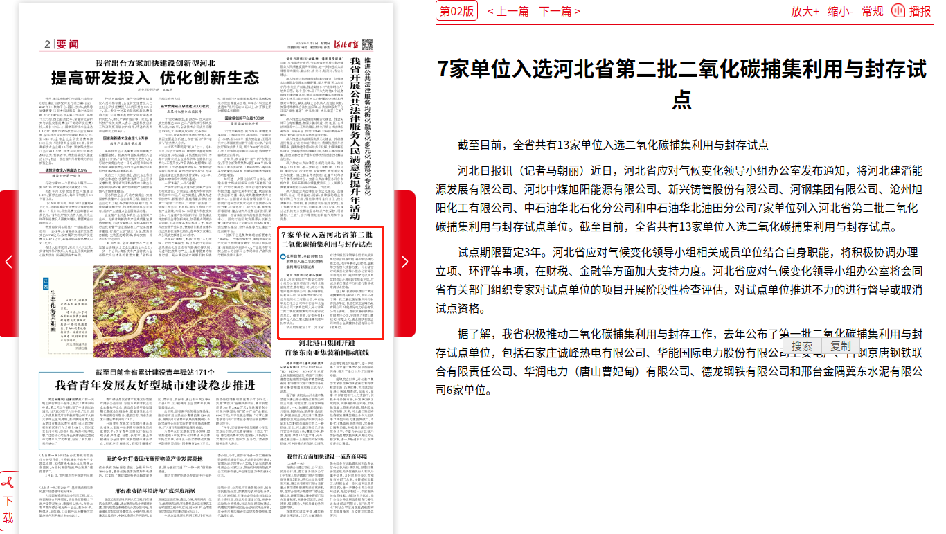 據(jù)了解,我省積極推動二氧化碳捕集利用與封存工作,去年公布了第一批二氧化碳捕集利用與封存試點單位,包括石家莊誠峰熱電有限公司、華能國際電力股份有限公司上安電廠、首鋼京唐鋼鐵聯(lián)合有限責(zé)任公司、華潤電力(唐山曹妃甸)有限公司、德龍鋼鐵有限公司和邢臺金隅冀東水泥有限公司6家單位。
